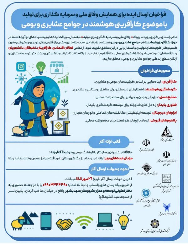 رویداد ملی «وفاق ملی و سرمایهگذاری برای تولید» را برگزار میکند.این فراخوان با هدف شناسایی و پرورش ایدههای خلاقانه، فناورانه و سازگار با فرهنگ بومی طراحی شده است؛ ایدههایی که بتوانند در مسیر توسعه کسبوکارهای محلی، ایجاد اشتغال پایدار، افزایش بهرهوری منابع و ارتقای سطح زندگی عشایر و جوامع روستایی گام بردارند.