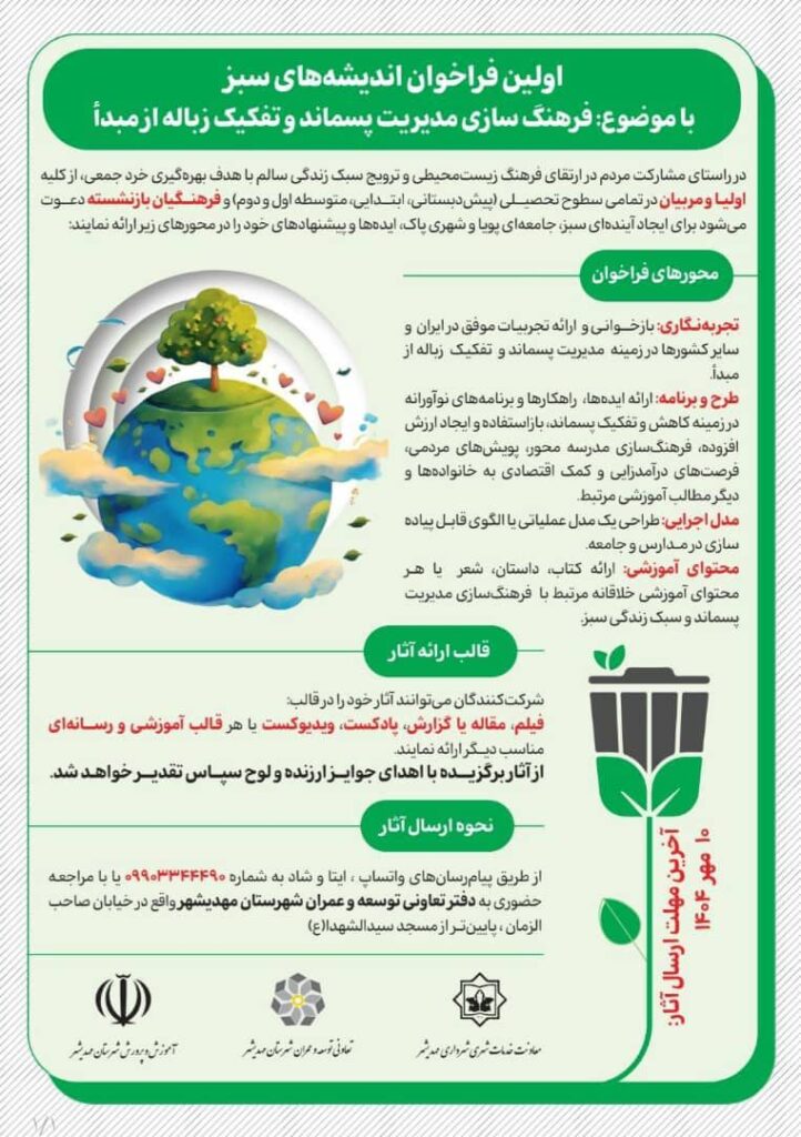 در راستای ارتقای فرهنگ زیستمحیطی، ترویج سبک زندگی سبز و جلب مشارکت مردمی در مدیریت پسماند،تعاونی توسعه و عمران شهرستان مهدیشهر با همکاری اداره آموزش و پرورش شهرستان، نخستین فراخوان«اندیشههای سبز» را برگزار میکند. این فراخوان با هدف شناسایی ایدههای خلاقانه در زمینه تفکیک زباله از مبدأ، بازیافت، بازاستفاده و کاهش تولید پسماند طراحی شده است؛رویدادی که میکوشد با تکیه بر خرد جمعی خانوادهها، مربیان، دانشآموزان و فرهنگیان، مسیر تازهای برای جامعهای پاک، شهری سالم و آیندهای سبز ترسیم کند.